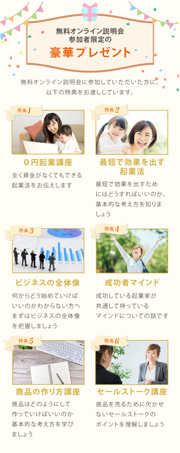 無料説明会に参加していただいた方に、以下の特典をお渡ししています。